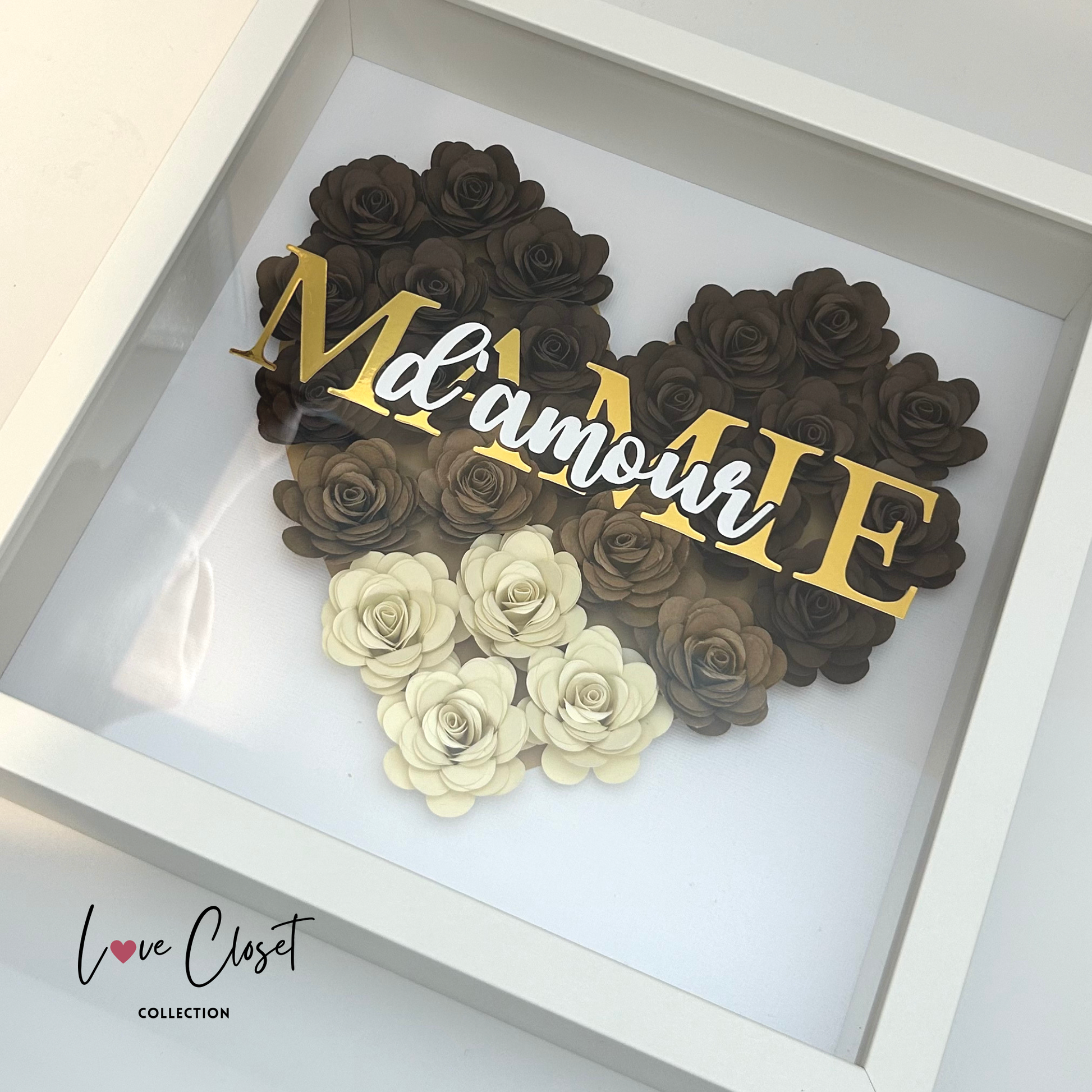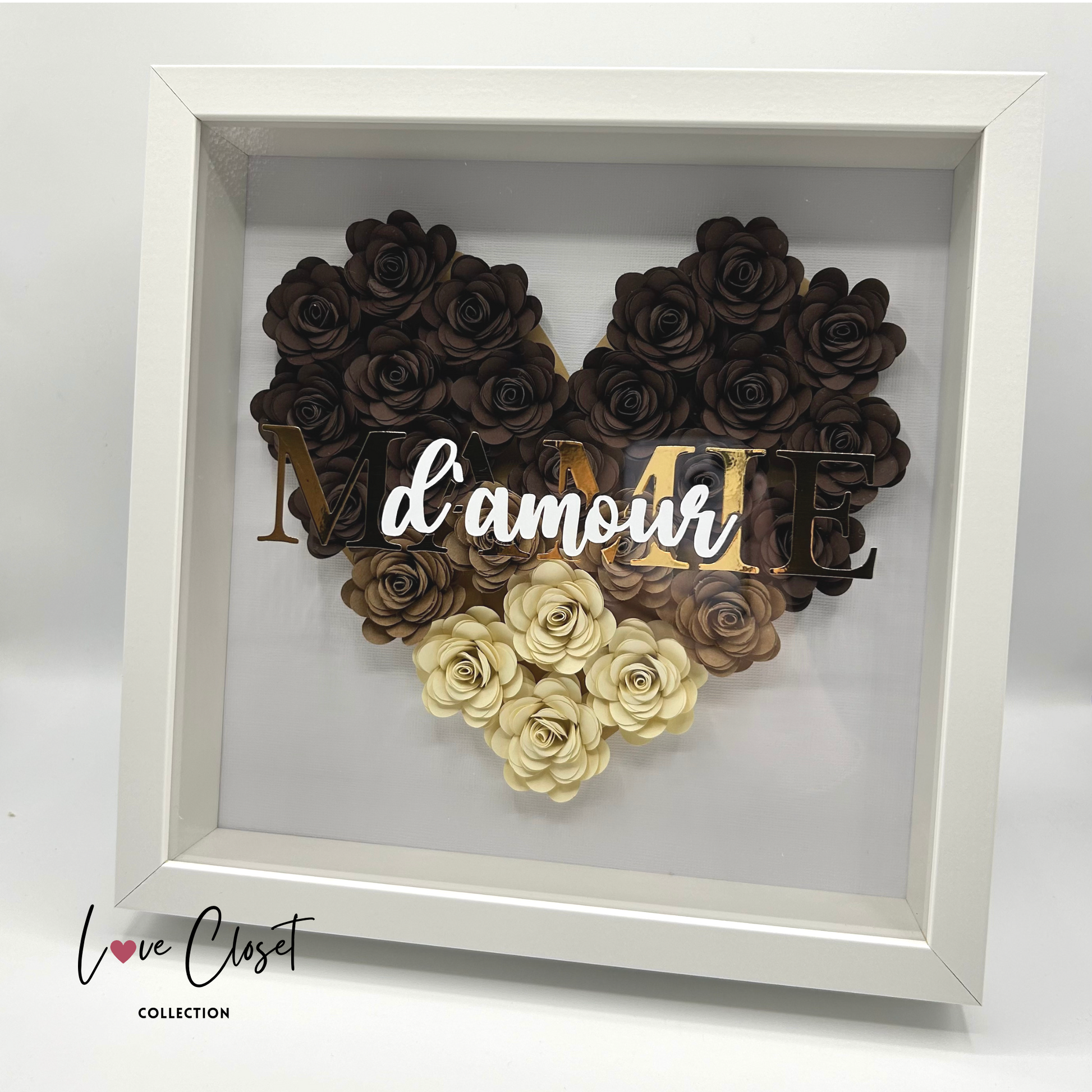 Notre cadre 3D floral « Mamie » est une idée de cadeau original pour la fête des grands-mères, pour Noël ou pour d'autres occasions et peut être une belle décoration d'intérieur. Celui-ci représente un cœur composé de fleurs en papier roulées et disposées à la main avec soin et de manière élégante et artistique.