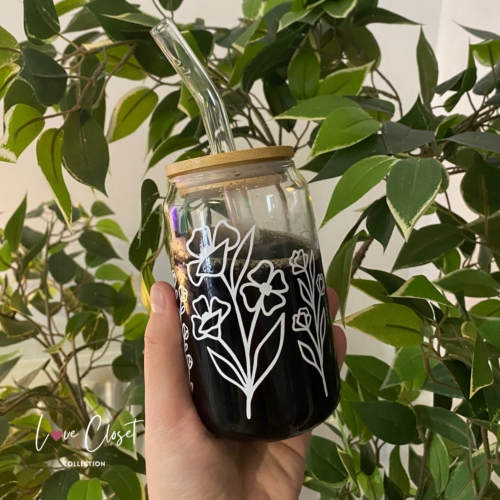 Ce verre à paille « Garden » de petite contenance (400ml) est livré avec un couvercle en bambou, une paille en verre réutilisable et sa brosse de nettoyage.
